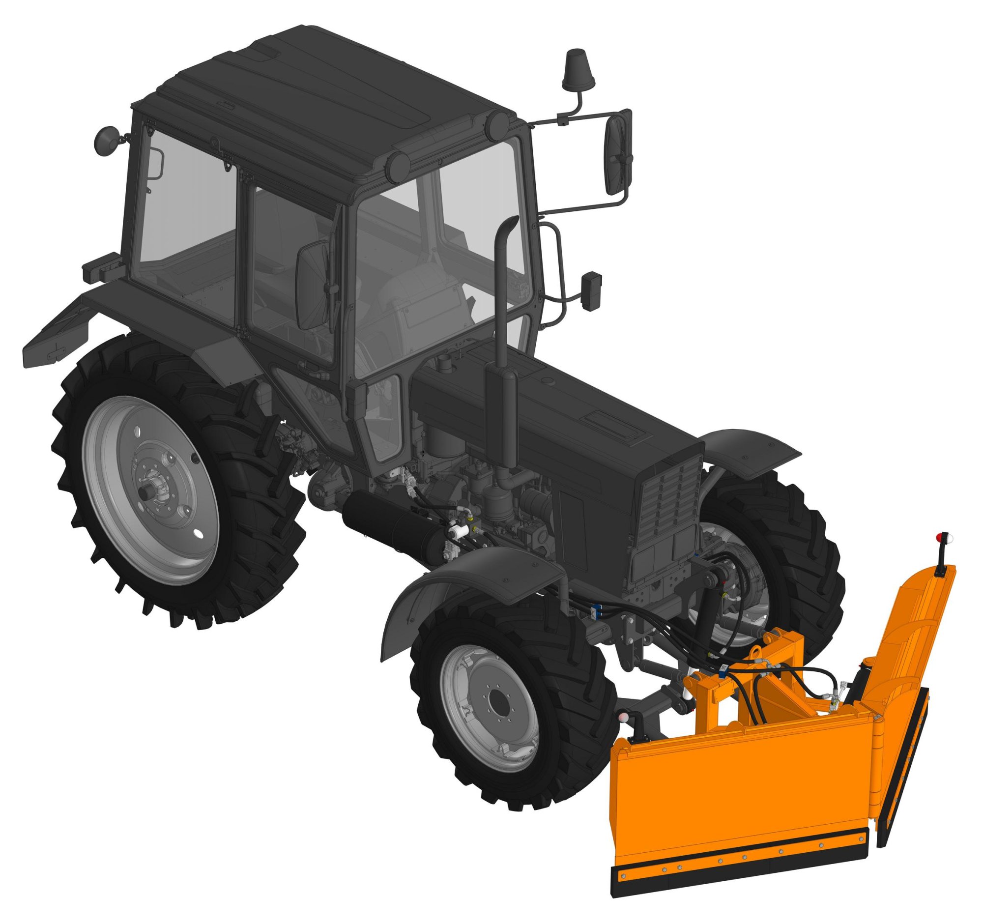 Поворот отвала (изменения угла положения) осуществляется гидроцилиндрами с управлением из кабины трактора.
