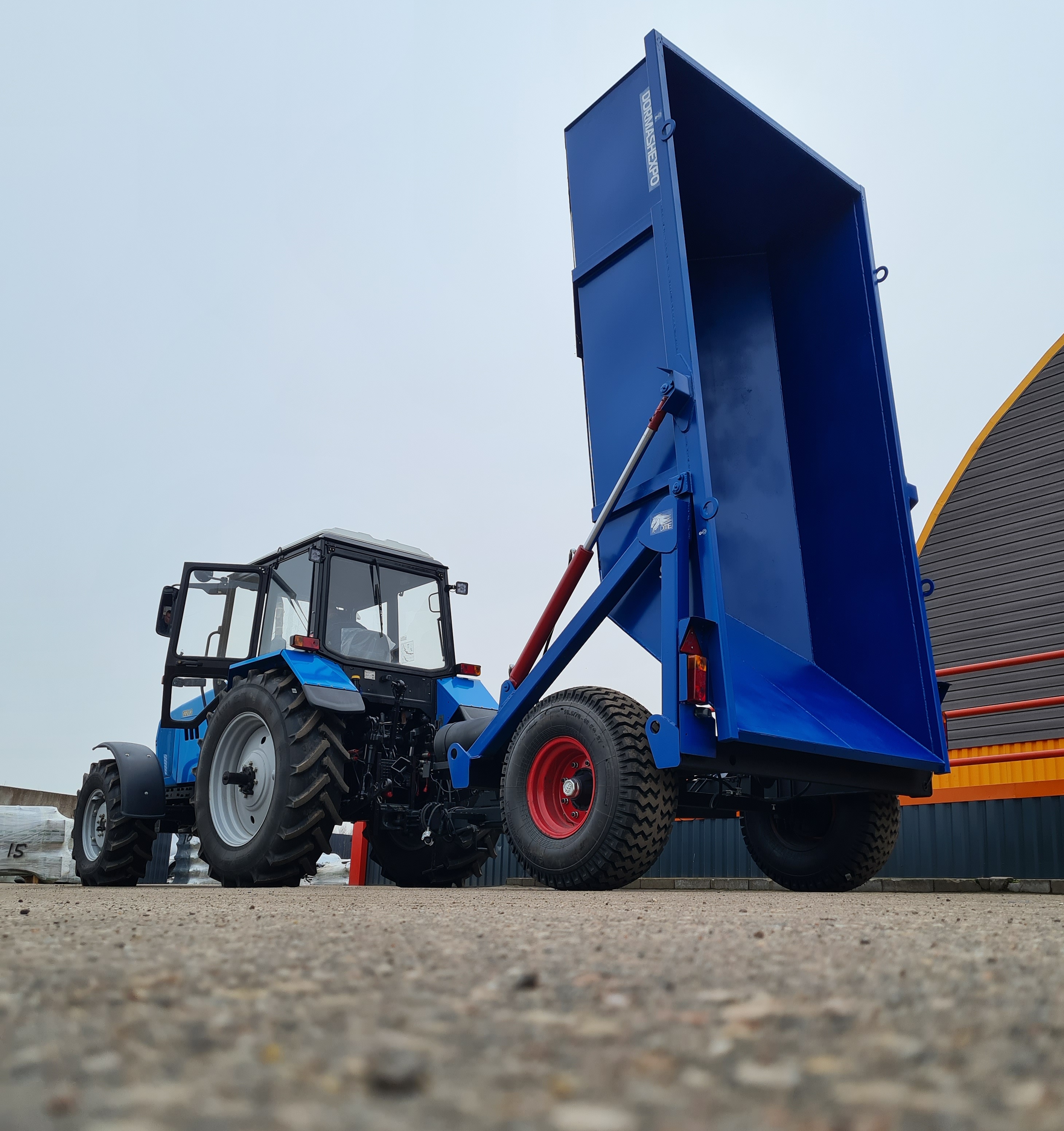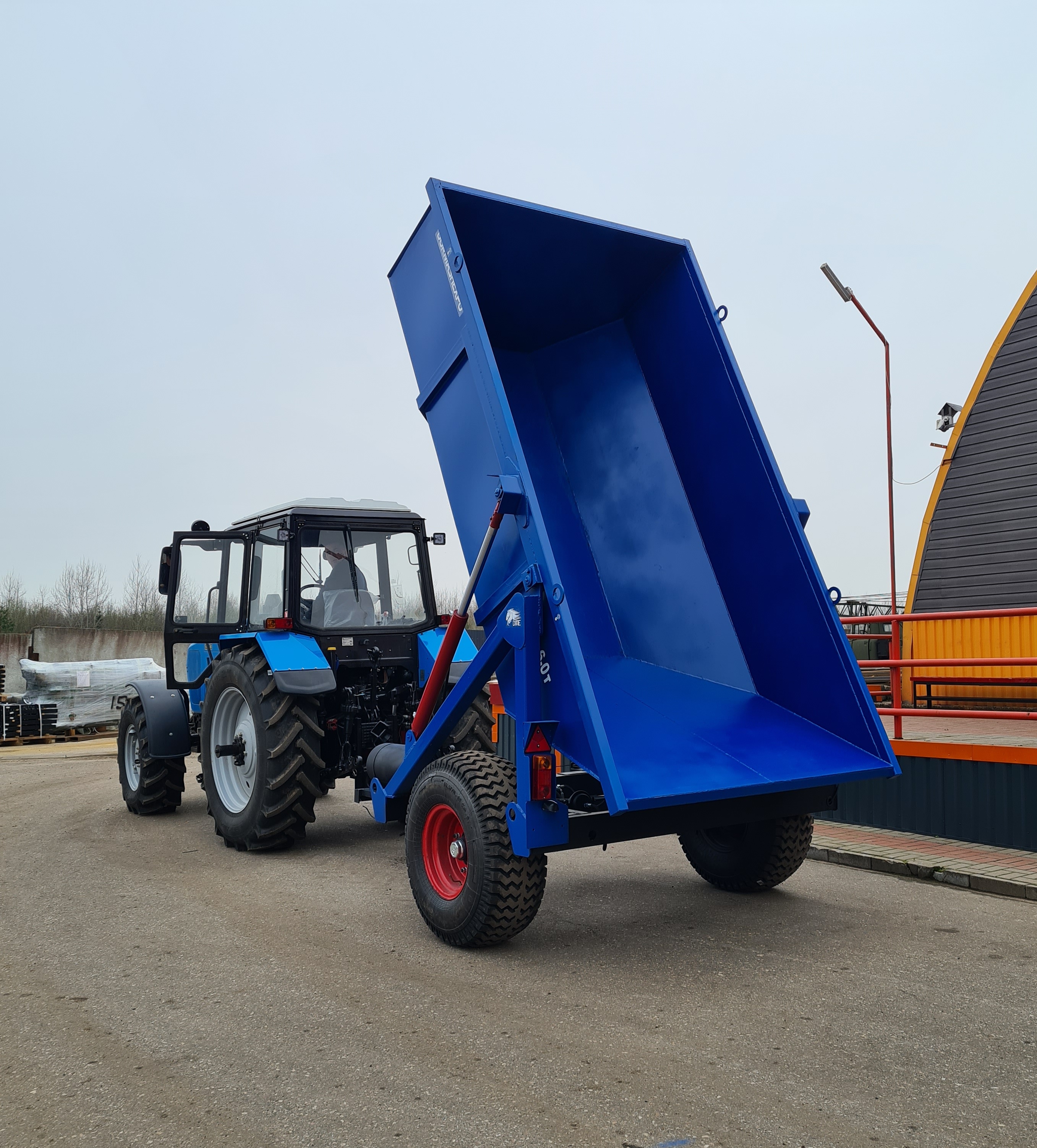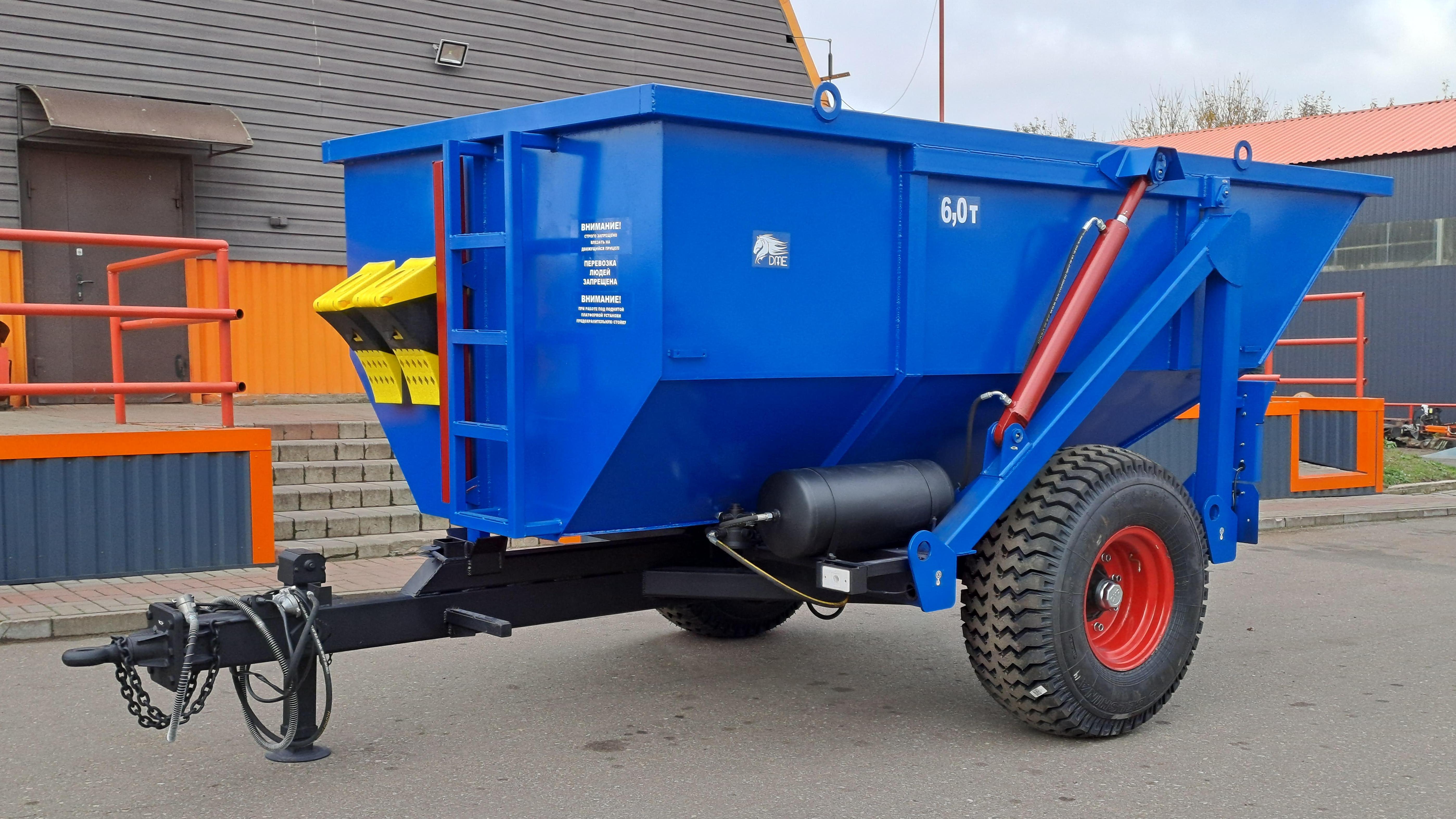 Опрокидывающий механизм кузова работает от гидросистемы трактора и состоит из разрывной полумуфты, трубопроводов, шлангов высокого давления, крана ограничения подъема кузова и гидроцилиндров. Гидроцилиндры телескопического типа. Стойка предохранительная предназначена для удержания порожнего кузова в поднятом положении при проведении работ по техническому обслуживанию. Кузов имеет форму трапеции. Конструкция сварная. Дышло полуприцепа сварное. Имеет убирающуюся опору для фиксации кузова на грунте. Дышло оснащено поворотной сцепной петлей.