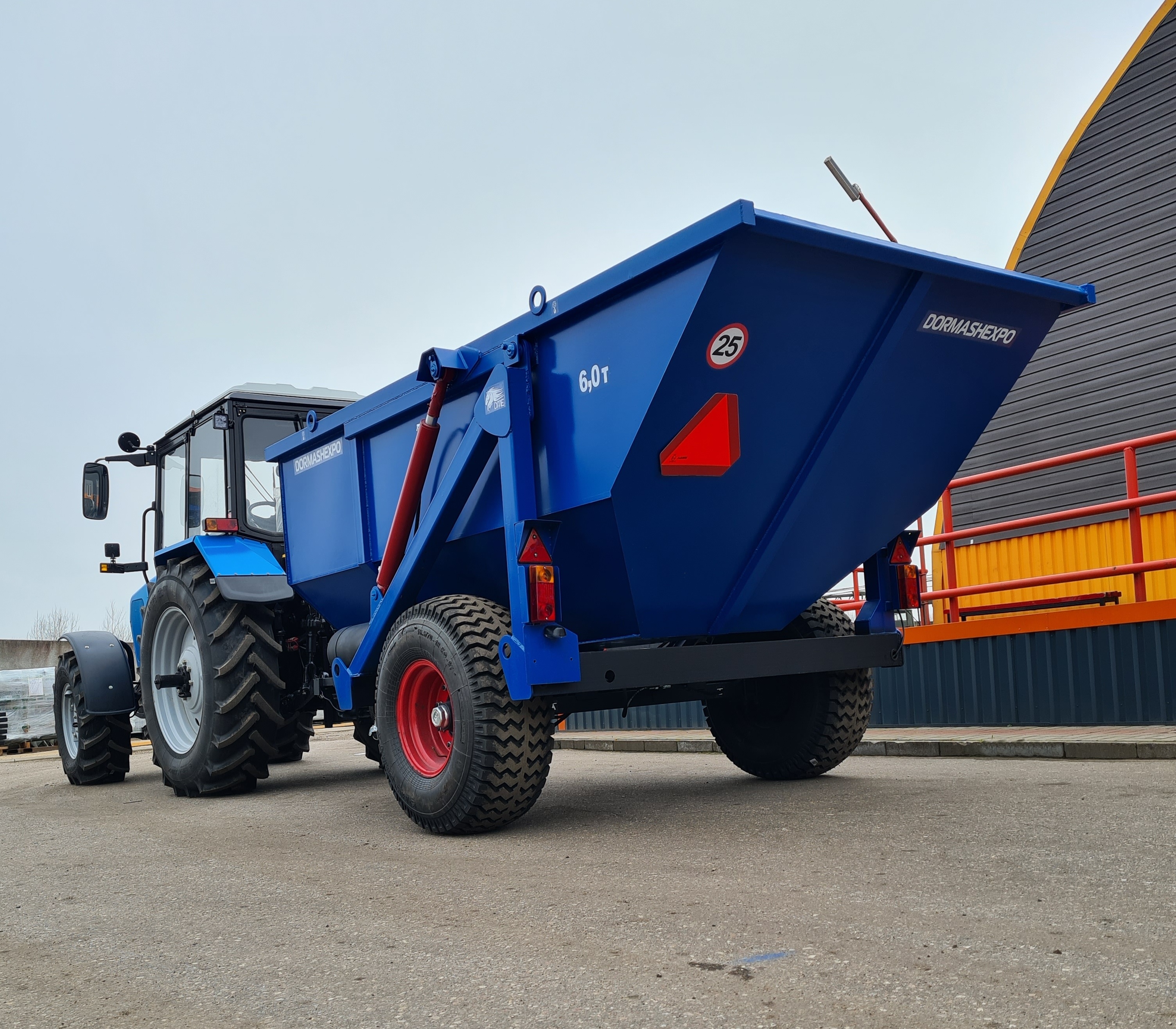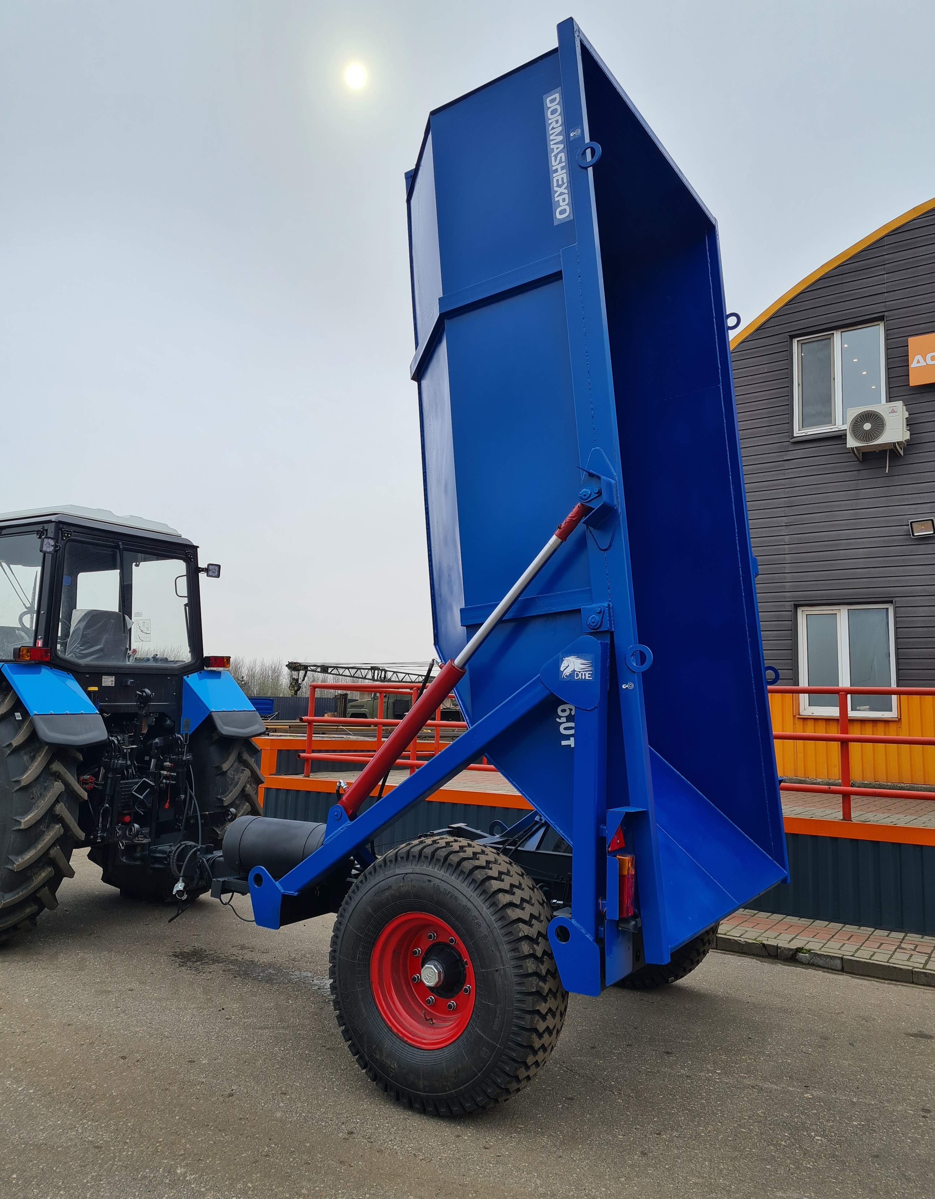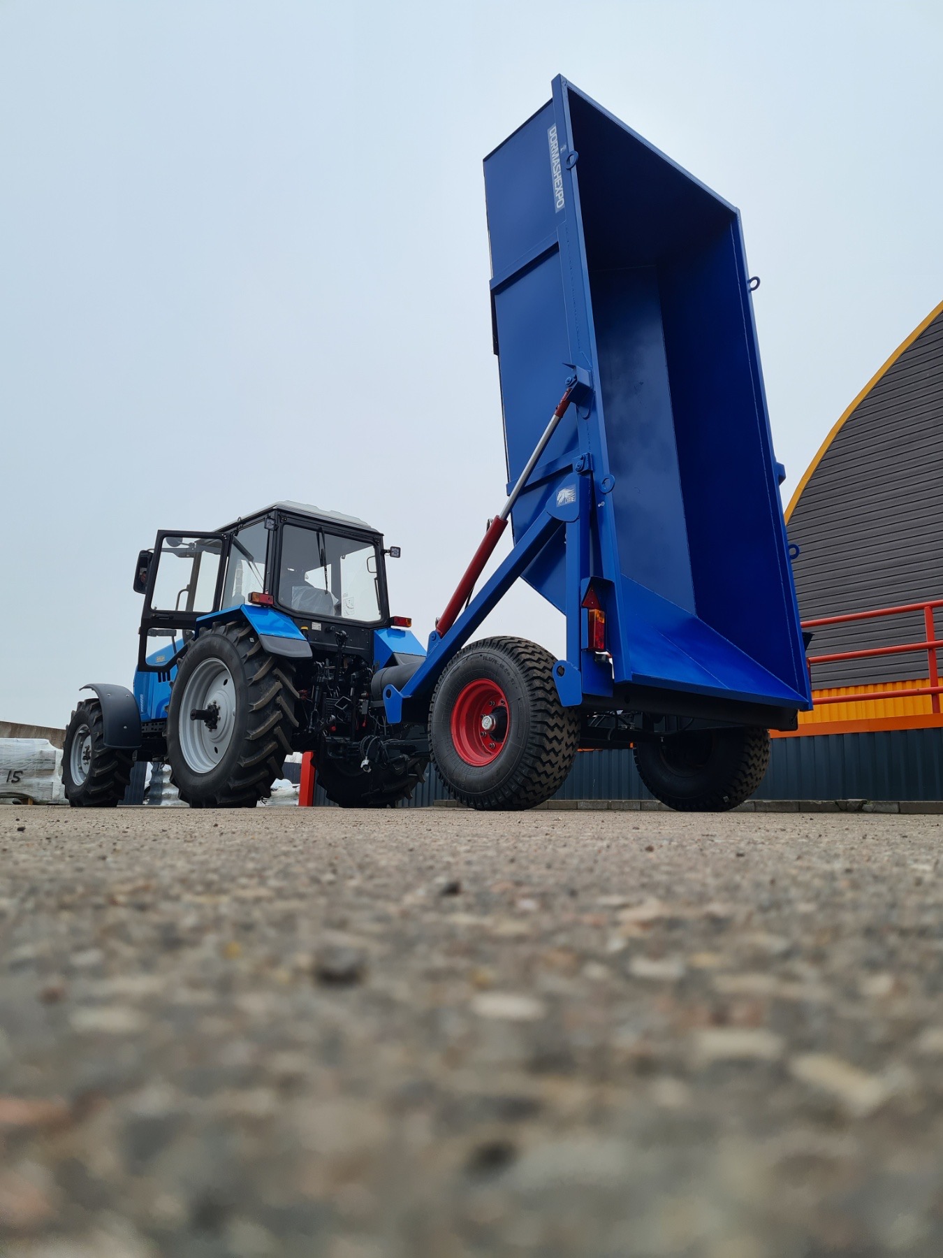 Опрокидывающий механизм кузова работает от гидросистемы трактора и состоит из разрывной полумуфты, трубопроводов, шлангов высокого давления, крана ограничения подъема кузова и гидроцилиндров. Гидроцилиндры телескопического типа. Стойка предохранительная предназначена для удержания порожнего кузова в поднятом положении при проведении работ по техническому обслуживанию. Кузов имеет форму трапеции. Конструкция сварная. Дышло полуприцепа сварное. Имеет убирающуюся опору для фиксации кузова на грунте. Дышло оснащено поворотной сцепной петлей.